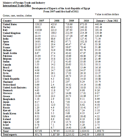 According to the most recent statements issued by the International Trade office at the Ministry of Industry and Foreign Trade, as illustrated in Table (1), the volume of Egyptian exports of cotton, yarn, textiles and clothes reached USD1.689 billion during the first six months of 2011; exports rose from USD651.8 million in 2007 to 1.858 billion in 2008, to USD2.210 billion in 2009 and to USD2.948 billion in 2010.