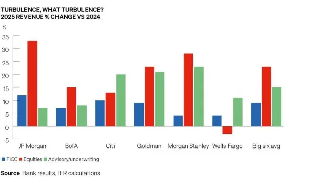 “Capital market revenues in 2025 beat the prior record in 2021 by 10% and should continue higher with strong backlogs, pent-up IB demand, good liquidity, and high stocks,” said Wells Fargo bank analyst Mike Mayo in a note. “The five large banks seem upbeat.”