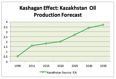 "Production growth, especially in the medium term, comes primarily from the Kashagan and Tengiz fields, pushing total supply up from 1.6 million bpd in 2011 to 3.7 million bpd in 2035," said the IEA in its global outlook report.