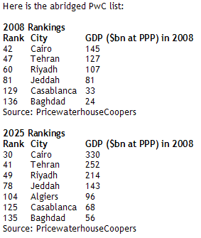 While McKinsey does not go into too much detail on Middle Eastern cities, a2008 PricewaterhouseCoopers (PwC) report estimated that Cairo was the wealthiest city in the Middle East ‑ and 42nd in the world ‑ generating $145-billion (at PPPs).