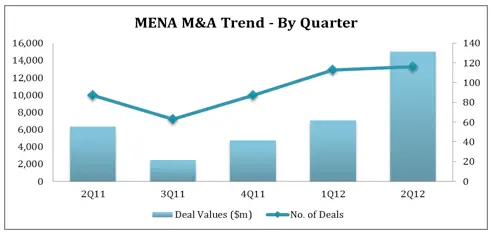 As MENA M&A activity witnessed an impressive increase in terms of volume and value in the last four consecutive quarters, the first six months of 2012 were able to sustain the positive trend. The number of deals increased by 24.45% compared to 1H11, reaching 229. However, total deal value dropped 4% to USD 22 billion, compared to 1H11's USD 23 billion.