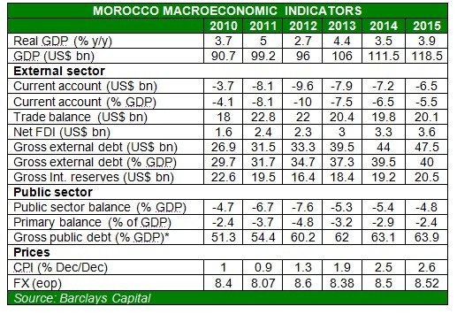 "On the fiscal front, the challenge of fiscal consolidation amidst lower growth and higher oil prices will be difficult. Rising spending and falling revenue widened Morocco's overall fiscal deficit by 41.5% y/y to MAD 28.7 billion (USD 3.5 billion) in the first four months of the year," said Barclays Capital in a note.