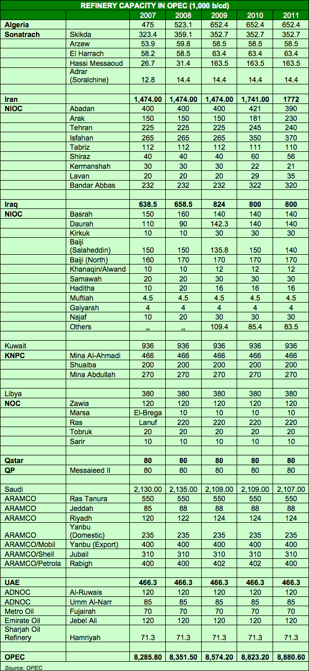 "In addition to projects aimed at upgrading and de-bottlenecking the existing refineries, design work is at various stages for large projects in Karbala (140,000 bpd), Nassiriyah (300,000 bpd), Kirkuk (150,000 bpd) and Missan (150,000) that would increase refinery capacity by almost 750,000 bpd."