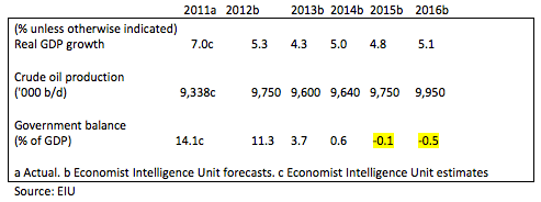 The EIU forecasts that the Saudi budget will slip into deficit starting 2015. However, the deficit shortfall expected would be small, EIU adds, reaching 0.1% of GDP in 2015, and 0.5% of GDP in 2016.