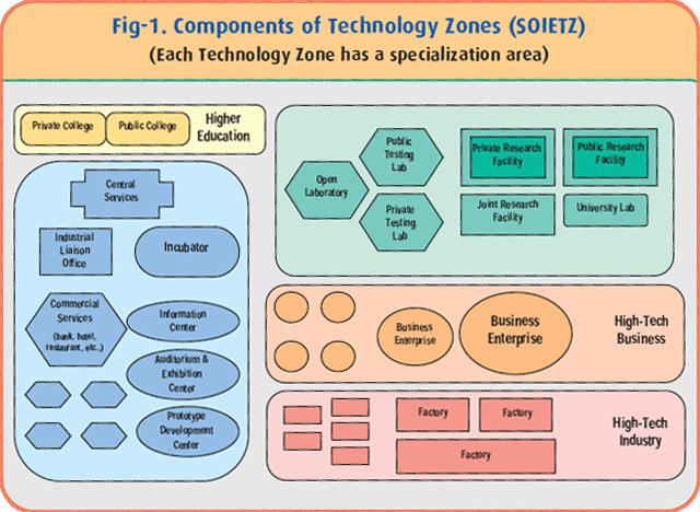 Technology zones are designed to facilitate the production and commercialization of advanced technologies by forging synergies among research centers, education institutions, and technologybased companies.
