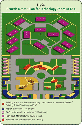 Technology zones in KSA will take the form of high technology industrial parks, which shall cluster together production-research-development-commerce- consultation-education-training to create a cohesive knowledge based environment.