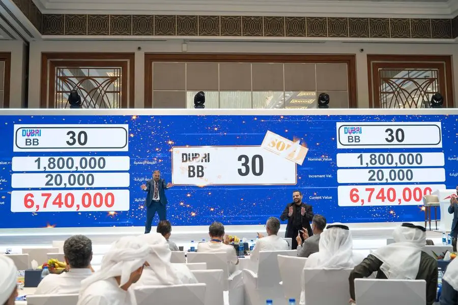 Plate number BB12 recorded the highest value at the auction at AED9.66 million, followed by plate number AA25 at AED8.04 million, plate number BB30 at AED6.74 million, and plate number CC100 at AED4.21 million.