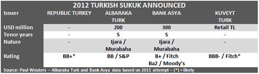Whilst Kuveyt Turk took the honor of issuing the first two Turkish sukuk (one in October 2010, a three-year USD 100 million Cayman asset based Ijara/Murabaha, and the other in October 2011, a five-year USD 350 million full Turkish partly assed backed Ijara/Murabaha), it continued the momentum and announced the first retail Turkish lira sukuk for 2012.