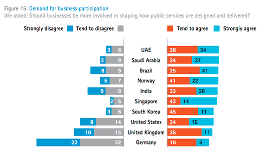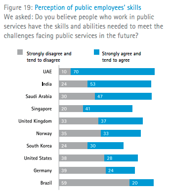 By contrast, 80 per cent of the survey respondents in the UAE - seen as an emerging leader in digital government - said their government is proactively addressing their priorities in health, employment and education.