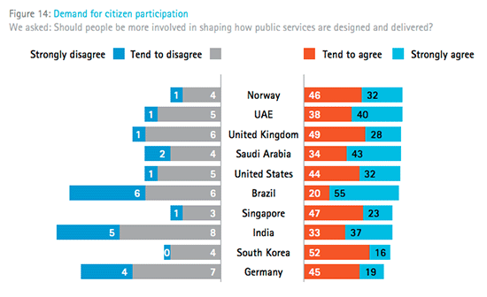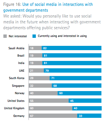 "Citizens' demand for digital services is even stronger in emerging markets such as India, Brazil, Saudi Arabia and the UAE, where 80 per cent of citizens said they would like to communicate with government via social media and on their mobiles."