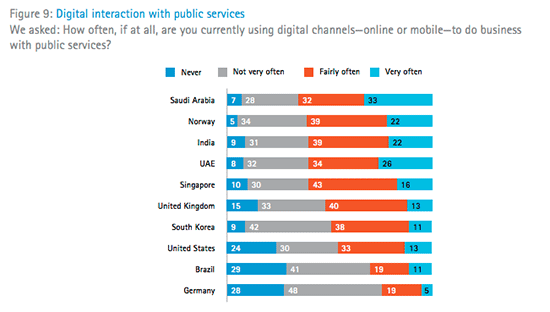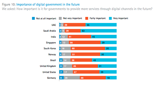 The study was conducted following a survey involving 5,000 people across the 10 countries. The survey found that the majority of respondents - 81 per cent - would like their government to provide more services through digital channels and 64 per cent would like to use social media to engage with government.