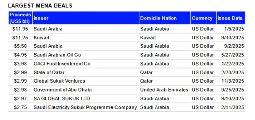 The largest MENA deal was Saudi Arabia's $11.95 billion triple tranche global bond. While Kuwait made a landmark return to global debt markets in late 2025 with an $11.25 billion three-tranche sovereign bond issuance, its first such deal since 2017, Qatar tapped the international debt market in October with a $2.99 billion sovereign bond issuance.