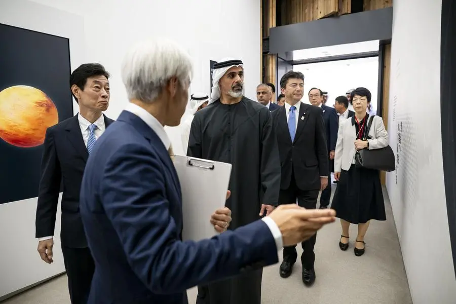 His Highness was accompanied by Sheikh Khalifa bin Tahnoon bin Mohammed Al Nahyan, Chairman of the Abu Dhabi Crown Prince Court; Dr Sultan Ahmed Al Jaber, Minister of Industry and Advanced Technology and UAE Special Envoy to Japan; Reem Al Hashimy, Minister of State for International Cooperation; Mohammed Ali Al Shorafa, Chairman of the Department of Municipalities and Transport; Saif Saeed Ghobash, Secretary-General of the Abu Dhabi Executive Council and Chairman of the Office of the Crown Prince; Maryam Eid AlMheiri, Chairperson of the Abu Dhabi Media Office and Advisor of Strategic Relations at the Crown Prince Court; and Shihab Ahmed Al Faheem, Ambassador Extraordinary and Plenipotentiary of the UAE to Japan and Commissioner General of the UAE Pavilion at Expo 2025 Osaka.