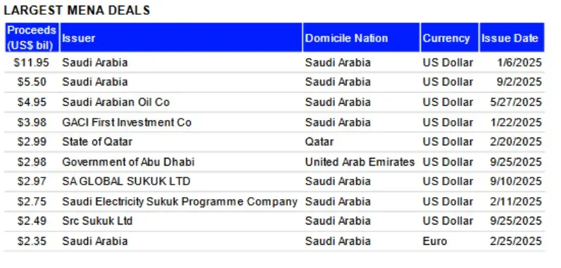 Saudi Arabia was the most active issuer nation during the first nine months of 2025, accounting for 54% of total bond proceeds, followed by the UAE (26%), and Qatar (9%).