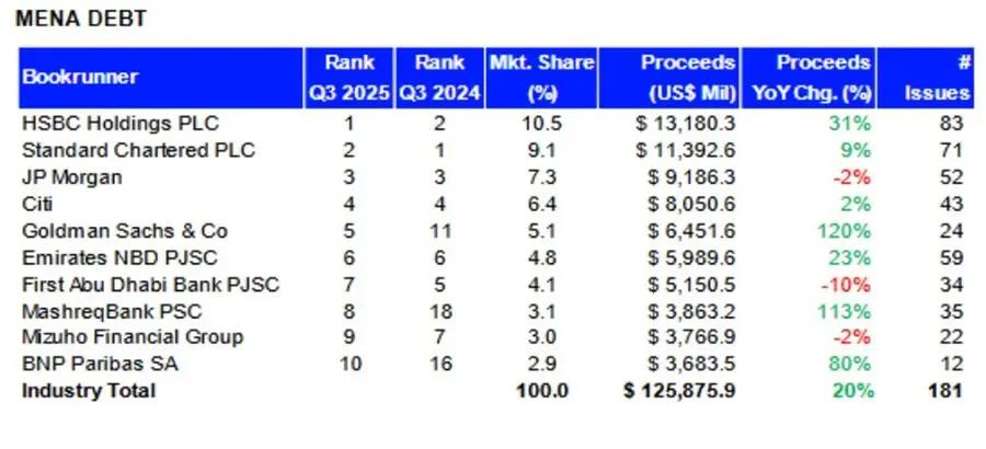 HSBC secured the top spot in the MENA bond bookrunner ranking by LSEG’s Investment Banking Review for the first nine months of 2025, with $13.2 billion in related proceeds and a 10.5% market share. Standard Chartered ranked second, followed by JPMorgan, Citi, and Goldman Sachs.