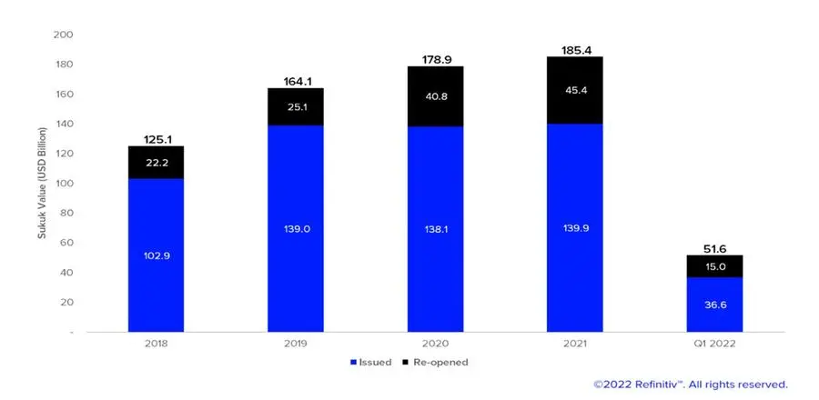 Sukuk issuance had a stronger than usual start to the year, based on the considerable momentum it had built up in 2021. Total sukuk issuance reached a total of $51.6 billion in Q1 2022, compared to $43.4 billion issued in Q1 2021, according to global data provider Refinitiv.