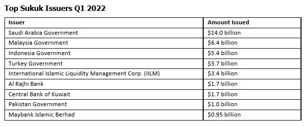 A boost came from sukuk issued by Saudi-based entities, which amounted to $17.9 billion in Q1 2022, outpacing issuances from market leader Malaysia for the first time. Sukuk issuance from Saudi Arabia nearly doubled from $9.3 billion in Q1 2021.