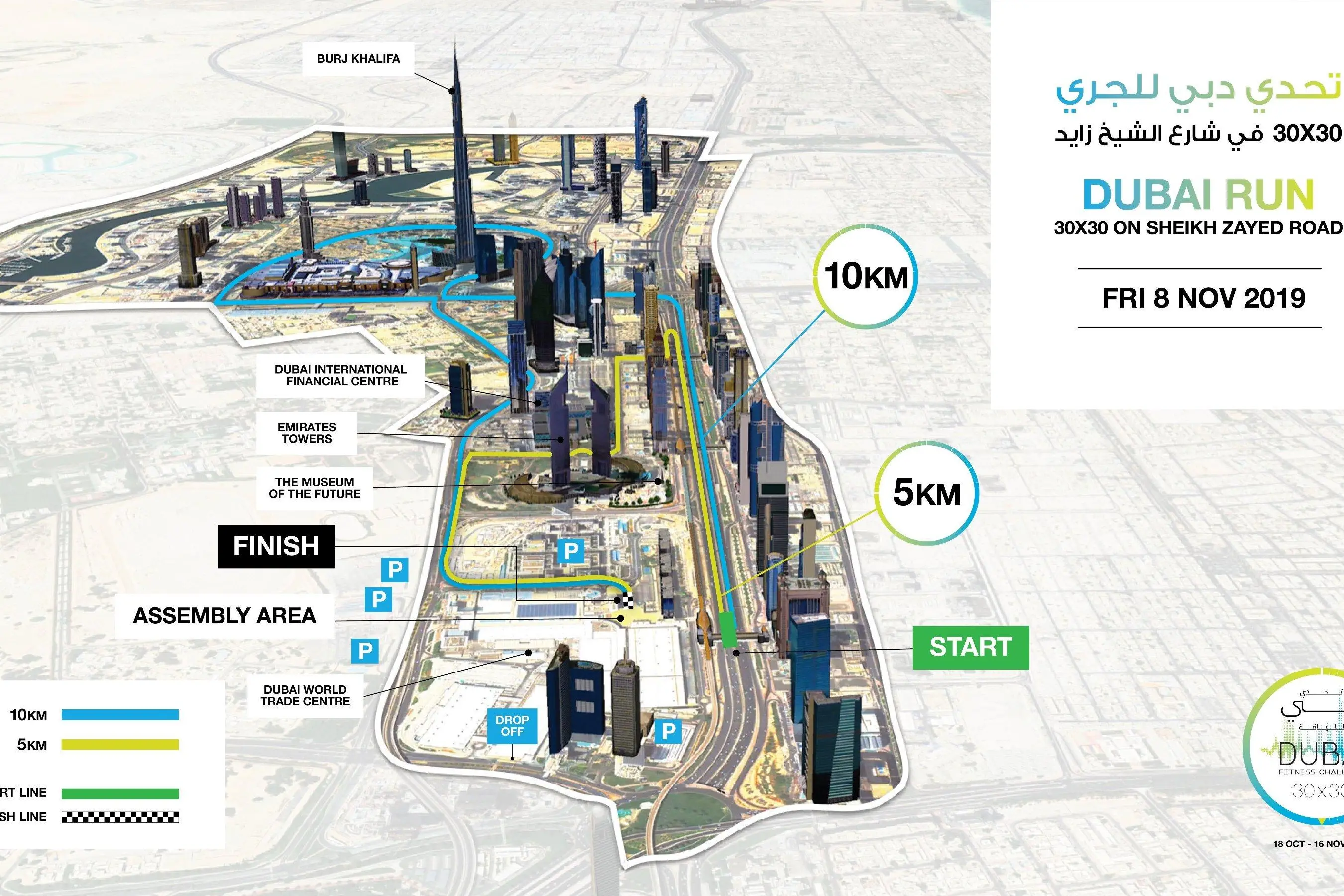 Both routes commence at Dubai World Trade Centre (DWTC), taking all participants along a 2.5km stretch of Sheikh Zayed Road. The 10km run will then see runners make a turn towards Financial Centre Road and along Sheikh Mohammed bin Rashid Boulevard past some of the city's most iconic buildings, before participants head back to the finish line at DWTC along Happiness Street.