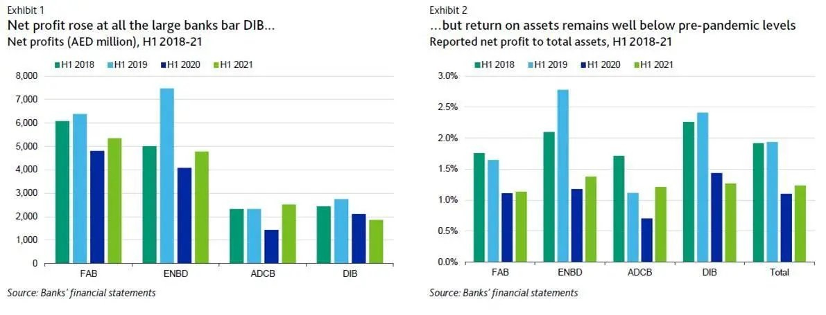 Profits at large UAE banks rose during the first six months of 2021 after a slight improvement in the operating environment led to lower loan-loss provisions, global ratings agency Moody’s said in a report. However, return on assets still remains well below pre-pandemic levels.