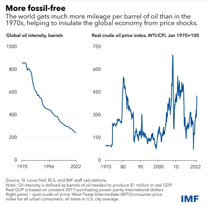 “The world [now] relies less on oil, easing any potential shocks. Economists track oil intensity by comparing how many barrels are needed to produce $1 million in gross domestic product, and this measure was about 3.5 times higher than current levels when crude prices almost tripled between August 1973 and January 1974,” the IMF said.