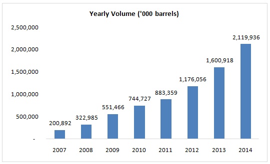 2,119,936,000 barrels of Oman crude oil traded on DME in 2014 compared to 1,600,918,000 barrels in 2013