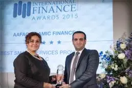 aafaq Islamic Finance, a leading provider of Islamic finance products and e-government services in the UAE, received two eminent awards from London-based International Finance Magazine (IFM) during the 2015 IFM Awards held recently at the Landmark Hotel, London. Mr. Mujtaba Naseem, DCEO & CFO at aafaq Islamic Finance, accepted the award for the 'Fastest Growing Finance Company - GCC 2015,' while Nihad Shahin, Secretary of the Boards of Directors at aafaq Islamic Finance, was given the trophy for the 'Best Smart Service Provider - GCC 2015' during a glittering ceremony that was attended by high profile guests, industry leaders, and representatives from the world's leading banking and financial institutions.