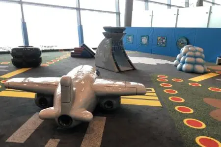 The kids play area in Terminal 1 includes a cloud slide, an airplane on clouds which kids can climb, and a baggage tug with a tunnel. Meanwhile, the kids play area located in Terminal 3 includes an airplane on clouds, resembling the one in Terminal 1, an air traffic control tower with a tunnel, a cloud tunnel, a suitcase slide, and tires for climbing.