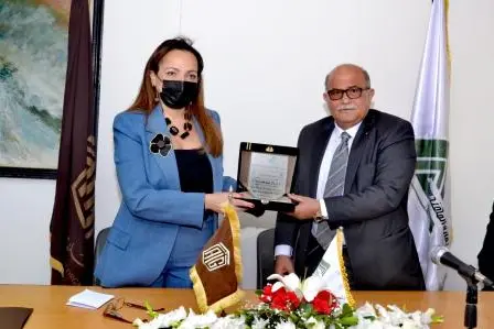Dr. Saudi presented an honorary shield to Dr. Abu-Ghazaleh, via Ms. AlLabbad, in recognition of his efforts in the field of knowledge development.