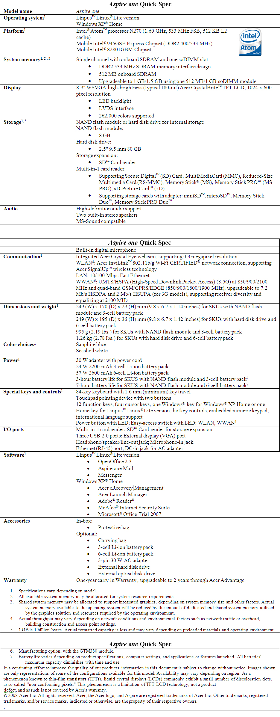 [2] Coverage depending on network availability. Upon launch the Aspire one will be WiFi enabled only. Embedded WiMax and 3G will be available later this year.
