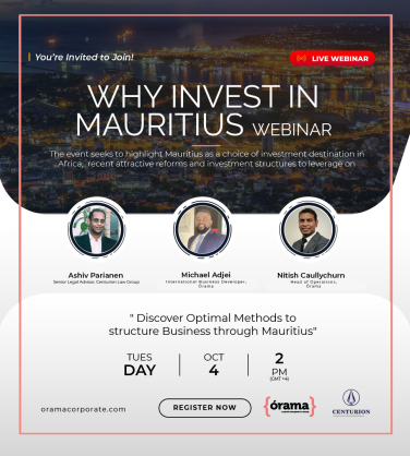 Centurion Law Group (https://CenturionLG.com) Mauritius and Órama Corporate Services Ltd will be hosting a webinar entitled “Why Invest in Mauritius (https://bit.ly/3fpbayK): The preferred choice of investment destination in Africa and available investment structures to maximize for optimal business advantage”.