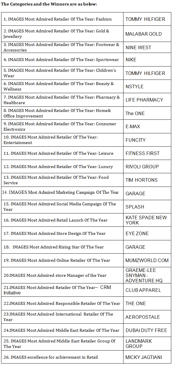 Amongst winners (listed below) in 26 different categories were Dubai Duty Free for Middle East retailer of the year. With the opening of concourse A in Jan 2013 DDF now operates a total of 2,79,862 sq. ft. of retail space across terminals 1, 2 and 3; Malabar Gold who won the Most Admired Middle East Retailer of the year: Gold & Jewellery, Malabar Gold and diamonds has more than 100 stores across seven countries; Nike won the Most Admired Middle East Retailer of the year: Sportswear, since 2012 NIKE has opened 10 new stores taking its total GLA upto 158,785 sq. ft. across the GCC; Life Pharmacy who won the Most Admired Retailer of the year: Pharmacy& Healthcare. Life commenced its journey as a retail Pharmacy group in 1996 and the strong impulse to perform has nurtured its growth over the last 17 years, at present the organization stands tall in the industry with over 100 retail outlets; Garage who won the Most Admired Marketing Campaign Of The Year is a very popular brand in Canada and the US and they were sponsors of the Justin Bieber Concert in Dubai; Eye Zone won the Store Design of the year the new design concept gives every store uniformity in form and atmosphere while ensuring a distinctive identity and mumzworld.com who won the Most Admired online Retailer of the year it is a bilingual e-commerce site for mothers in the Middle East created by mothers.