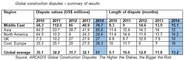 Middle East, Sunday 5 July 2015: Disputes relating to major Middle East construction projects increased significantly in value to $76.7 million in 2014 according to ARCADIS, the global natural and built asset design and consultancy firm.