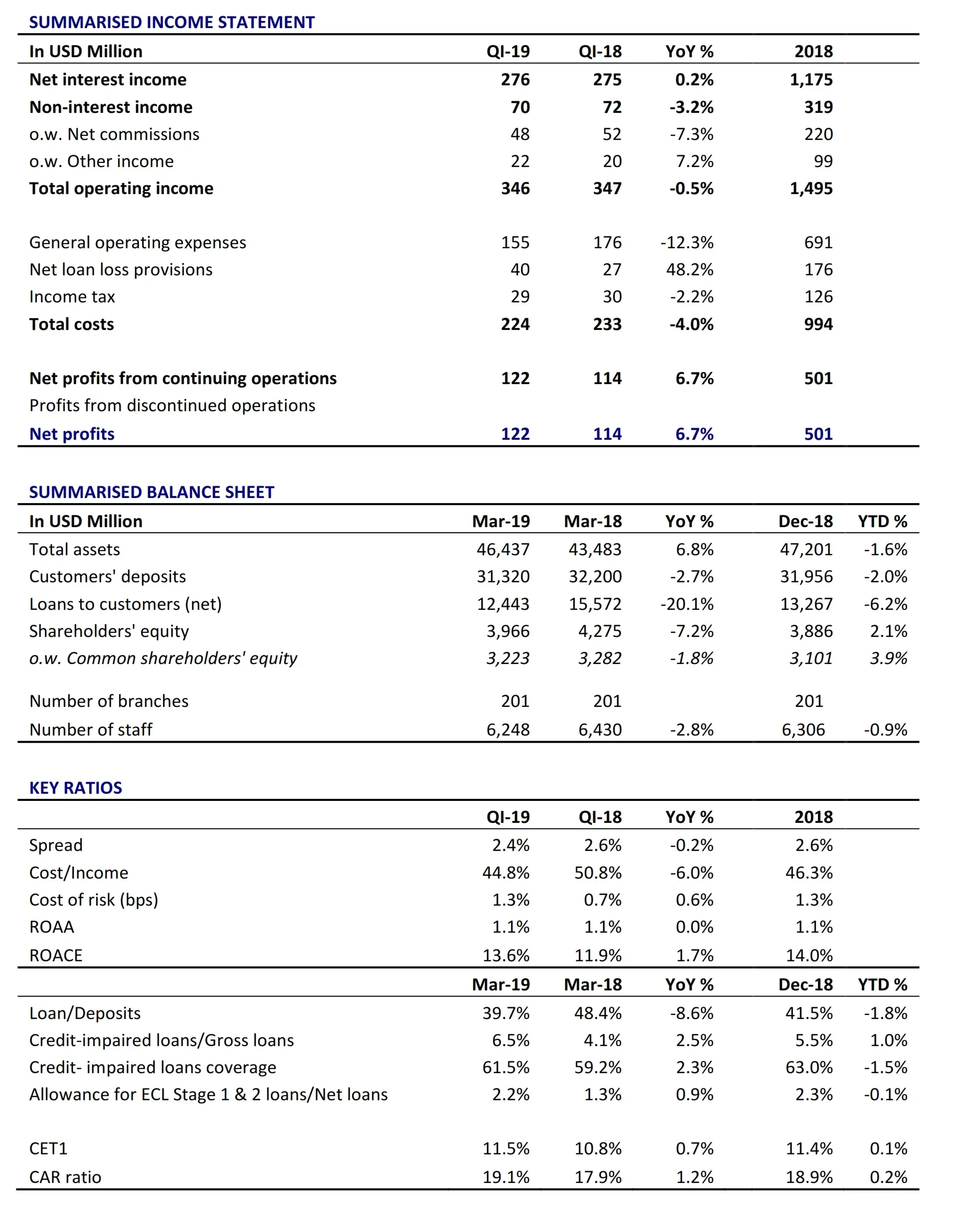 This performance is in line with the adopted budget for the period encompassing reinforcing the performance of the various entities of the Group in the overall, while sustaining interest margin and generating savings in operating expenses. In the first quarter of 2019, consolidated general operating expenses decreased year-on-year by USD 21.6 million, with those savings generated across all entities of the Group. This translated in a net improvement in the Bank's consolidated cost to income ratio by 6% from 50.8% in the first quarter of 2018 to 44.8% in the first quarter of 2019.