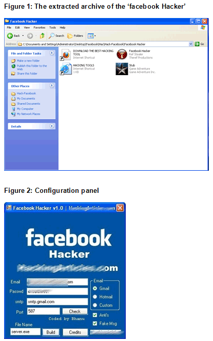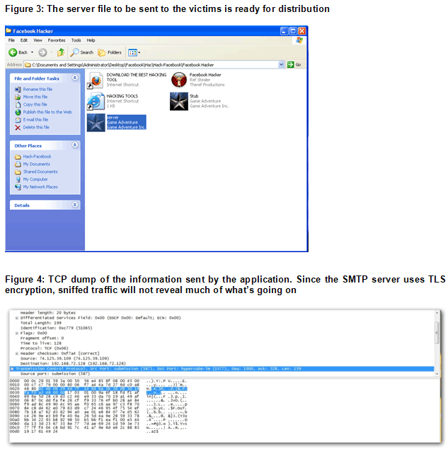 The kit is intuitive and hence extremely easy to configure, just like any do-it yourself hack tool designed with the "skiddie" in mind. There are only two fields that need filling in: a disposable e-mail and a password that will eventually constitute the location where the stolen information is to be delivered to (refer to Figure 1). After clicking the "build" button, a server.exe file is created and deposited into the 'facebook Hacker' folder along with the initial files. This server.exe file is to be sent to the intended victims (refer to Figures 2 and 3).