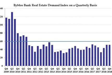Commenting on the results, Mr. Nassib Ghobril, Chief Economist and Head of the Economic Research and Analysis Department at the Byblos Bank Group, said: “real estate demand in the fourth quarter of the year was affected by the absence of concrete initiatives to stimulate demand in the real estate market, amid political uncertainties, stagnating consumer confidence and slow economic activity.'' As such, the Index’s average monthly score in the fourth quarter of 2018 came 61% lower than the peak of 131 points registered in the second quarter of 2010, and remained 53.4% below the annual peak of 109.8 points posted in 2010. Also, it was 14.1% lower than the Index's monthly trend average score of 59.6 points since the Index’s inception in July 2007.