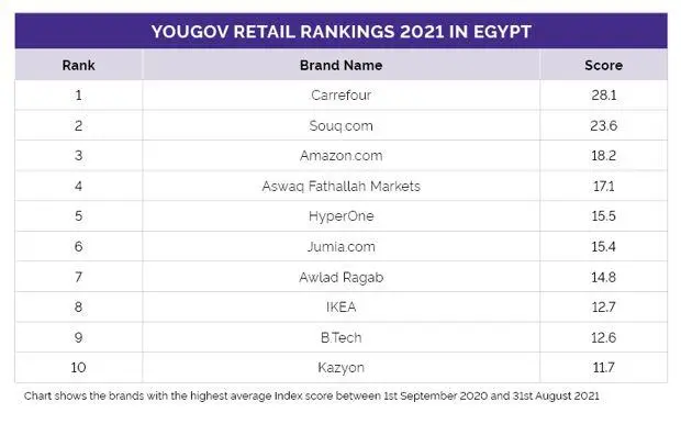 Carrefour tops YouGov’s Retail Rankings 2021 in Egypt within an Index score of 28.1.