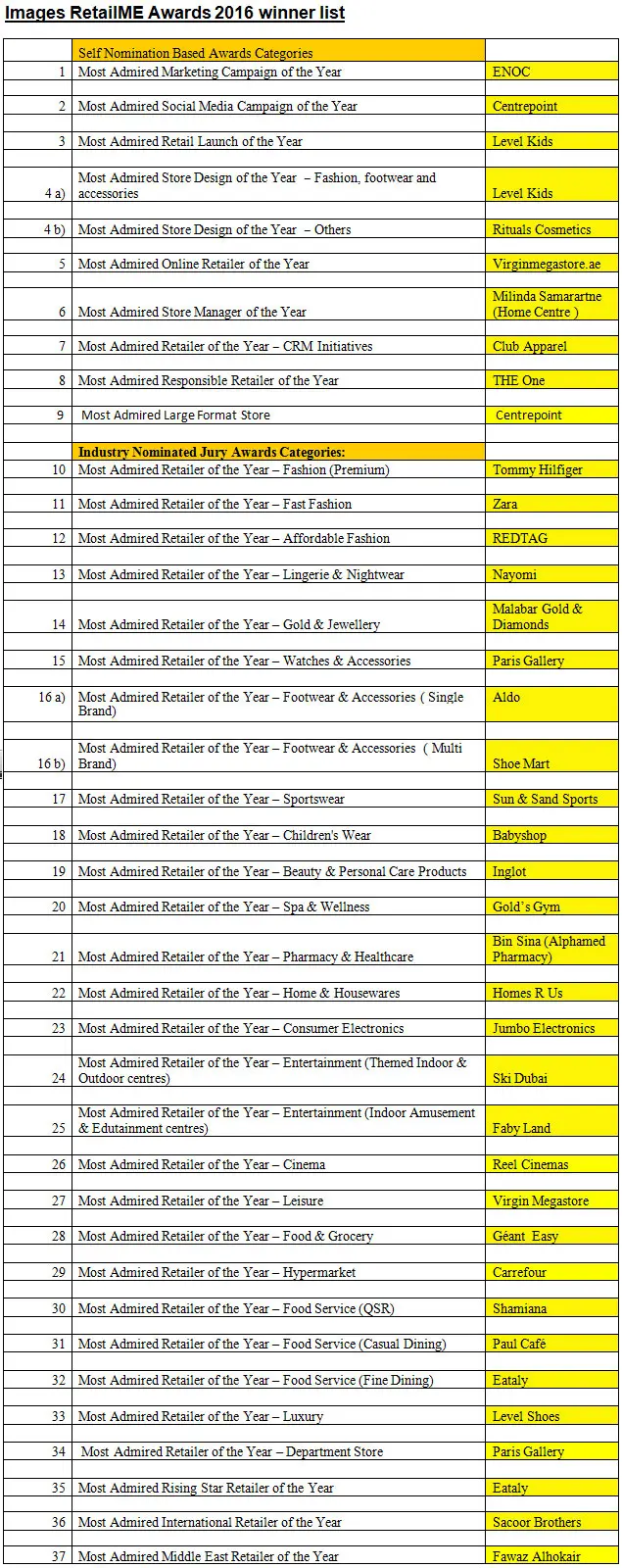 Fawaz Alhokair, AZADEA Group, Chalhoub Group, Paris Gallery, Apparel Group, Majid Al Futtaim, Landmark Group big winners at the Images RetailME Awards 2016