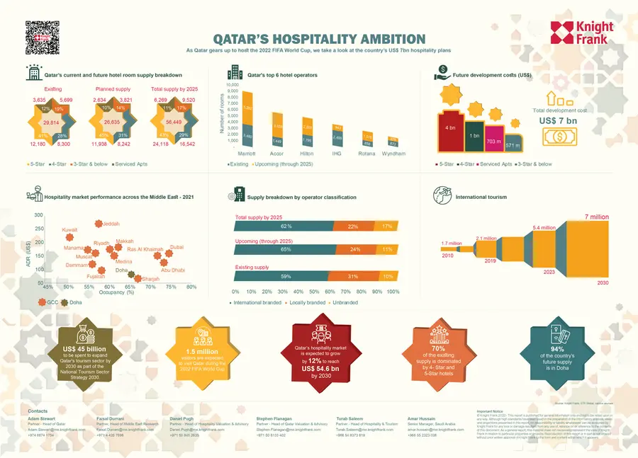 Faisal Durrani, Partner – Head of Middle East Research, Knight Frank, added: “While there is palpable excitement in Doha as the FIFA World Cup draws near, for the country’s hospitality sector the best is yet to come. Indeed, with nearly 27,000 hotel keys expected to be delivered in the next 3 years, there will be a phenomenal change in Qatar’s hotel offering by the end of 2025. The near doubling in capacity to over 56,000 rooms will be in a post-World Cup environment and comes as the country prepares for an anticipated visitor influx following heightened interest in Qatar once the excitement of the World Cup subsides.
