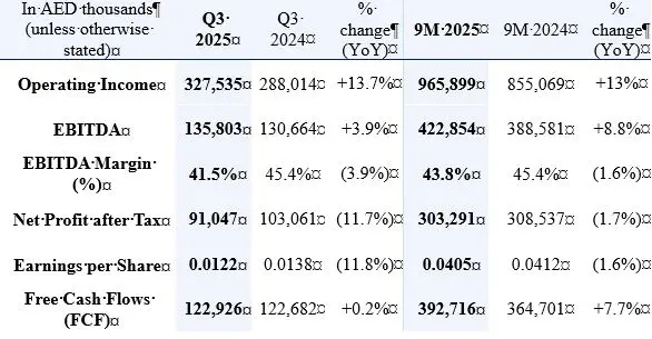 - Operating Income rose to AED 966 million for the 9M and grew 13.7% YoY to AED 328 million in Q3.