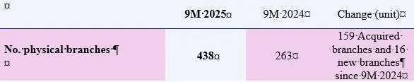 - Branch Network: The Group’s total number of physical branches reached 438 by the end of Q3 2025, marking a net addition of 175 branches since Q3 2024, including the consolidation of BFC Group.