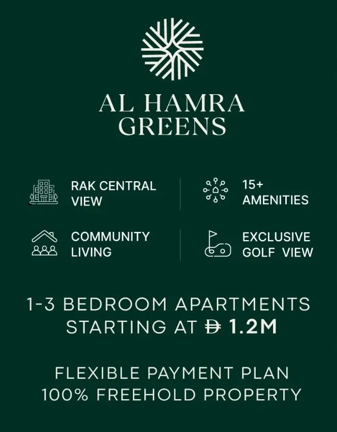 Al Hamra Greens is a wellness-centric community inspired by Scandinavian design and rooted in the philosophy of “Reconnect with Living.” Located opposite RAK Central, it offers breathtaking views of RAK’s urban hub, the Al Hamra Championship Golf Course, and Wynn Al Marjan Island. The project comprises 1,754 apartments in 1 to 3 bedroom layouts, all with private balconies for seamless indoor-outdoor living. Starting from AED 1.2 million, the development boasts an array of amenities including lush gardens, BBQ terraces, paddle tennis and basketball courts, jogging and cycling tracks, kids’ play zones, a pet park, a wellness spa, and a gym with panoramic views. Over 38% of the project sold out within 24 hours of launch.