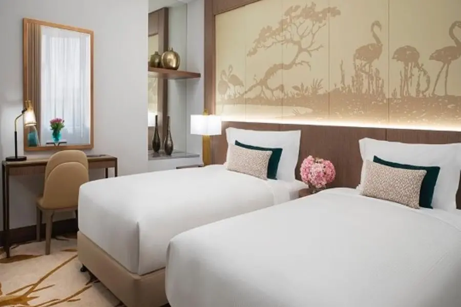Claire Craig, WA International’s design director, elaborates on the design philosophy: “Throughout the hotel, our references to the nearby mangroves with their leafy patterns and rich colors can be found in the interior architectural patterns and finishes. Custom-designed screens, furniture pieces, and lighting reflect the organic nature of the stunning Ras Al Khor Wildlife Sanctuary. The owner’s vision for generously oversized suites, ranging from 60m² to 232m², demonstrates a commitment to providing spacious luxury in Dubai’s competitive high-end market. In the studio and one-bedroom apartments, headboards feature hand-embroidered scenes of the mangroves, carpets are designed with leafy patterns, and organic plaster reliefs embellish the ceilings in the living rooms.”