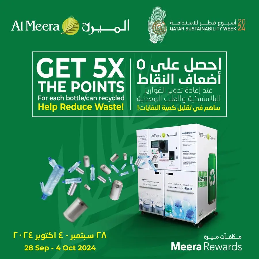 During this year’s Sustainability Week, Al Meera customers had the chance to earn 5 times the Meera Rewards points by depositing bottles or cans in any of Al Meera’s reverse vending machine (RVMs), in a bid to encourage recycling. Customers who purchased reusable bags at any Al Meera branch during Sustainability Week also received 5 times the Meera Rewards points, reinforcing the importance of reducing single-use plastics.