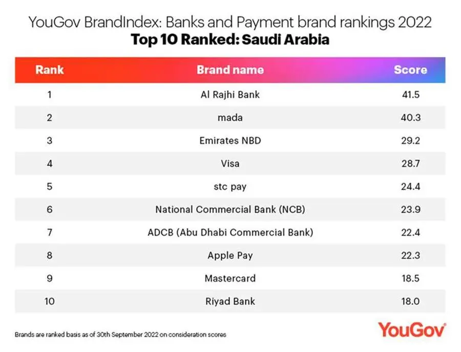 Saudi Arabia’s payment system mada is second in the list (with a Consideration score of 40.3), followed by Emirates NBD in third (29.2).