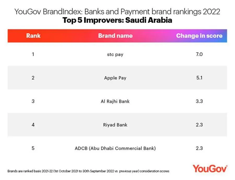 Many payments and technology companies feature in the list such as Visa in fourth (28.7), stc pay in fifth (24.4), Apple Pay in eighth (22.3) and Mastercard in ninth (18.5).