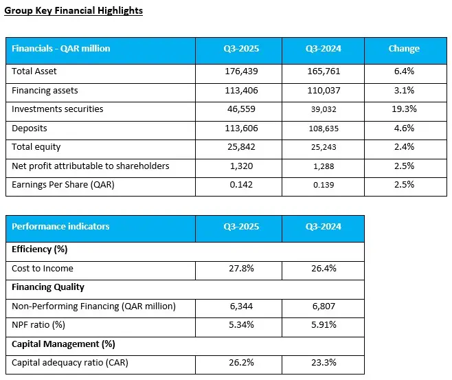 “Our continued strong performance across Qatar and international markets reflects the strength of our strategy and the trust of our clients. As of 30 September 2025, the Group’s total assets surged to QAR 176 billion, up 6.4% year-on-year, driven by robust growth in investment securities (+19.3%) and financing assets (+3.1%). In Q3, our fully owned subsidiary, AlRayan Investment, was named the Best Equity Manager at the 2025 MENA Banking Excellence Awards organized by MEED. In addition, the Bank also launched a new trade finance digital platform which allows full automation of all customer trade transactions. These achievements not only reinforce our leadership in the financial sector but also highlight our firm commitment to innovation, digital transformation, and delivering Sharia-compliant banking solutions that put our customers first”.