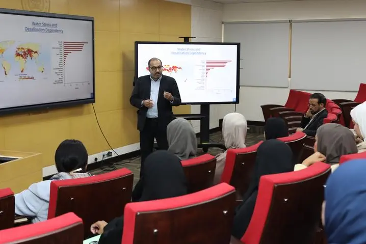Manama – The Shaikh Khalifa bin Hamad Al Thani Chair in Geographic Information Systems and the Shaikh Isa bin Salman Al Khalifa Academic Chair in Technology Management, hosted by the College of Education and Administrative and Technical Sciences at the Arabian Gulf University (AGU), welcomed a number of engineers from the Electricity and Water Authority of the Kingdom of Bahrain to deliver an extensive scientific seminar on the national experience in water desalination. The seminar was held as part of the postgraduate course “Selection and Deployment of Technologies”, within the framework of cooperation between the University and national institutions and government ministries in Bahrain and the GCC.