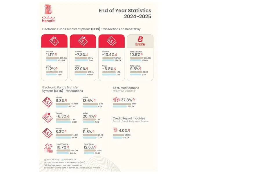 BENEFIT further explained that the total volume of Fawri+ transactions on all channels reached 467.9 million transactions in 2025, marking an increase of 11.3% compared to 420.3 million transactions recorded in the previous year. The total value of Fawri+ transactions increased from BD 8.6 billion to BD 9.7 billion in 2025, reflecting a growth of 13.6%. Transactions conducted via the BenefitPay app also recorded an 11.1% increase, reaching 455.3 million transactions with a total value of BD 8.7 billion.