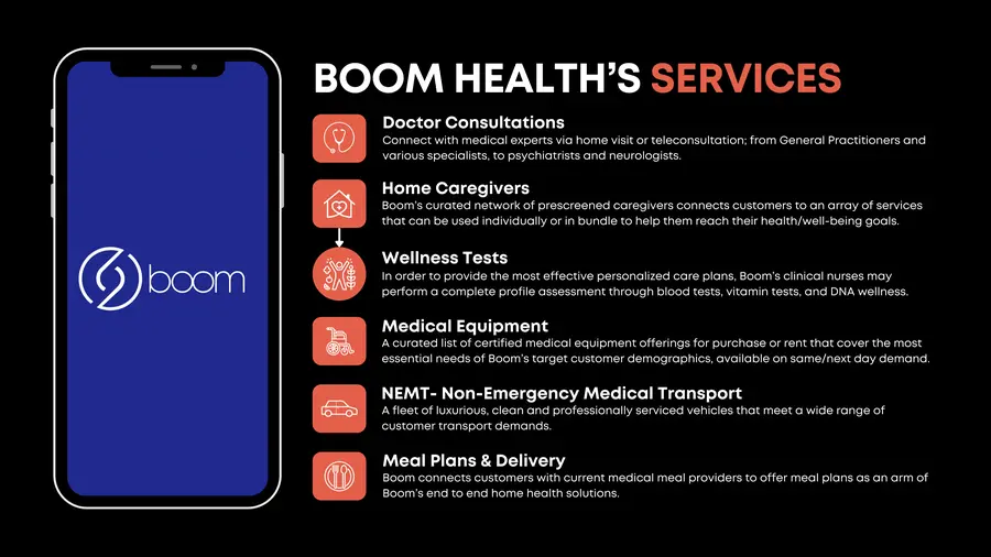 The Boom Health app offers users an all-in-one digital experience for home healthcare coordination and personalised care plans built on a foundation of robust data privacy and security features. The app aggregates top healthcare services at competitive prices, including virtual consultations, in-home caretaker visits, appointment scheduling, medical equipment supplies, and non-emergency transport, providing users with unparalleled convenience and accessibility.