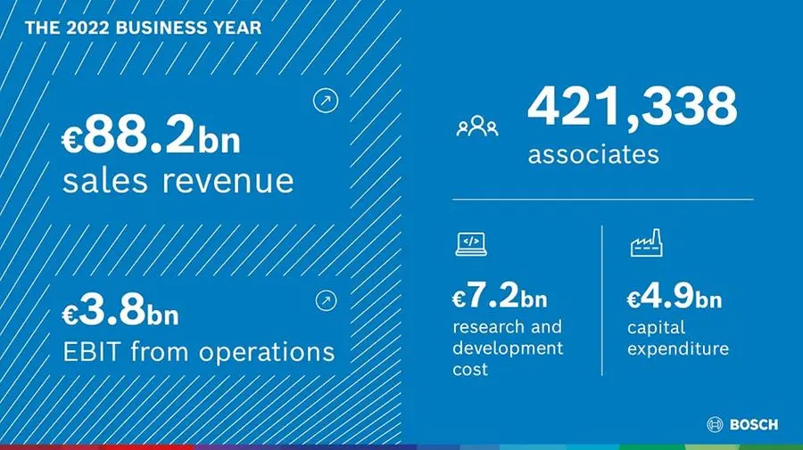 Dubai, UAE: In 2022, Bosch exceeded its business targets in what was a challenging year. The supplier of technology and services increased its total sales to 88.2 billion euros, following 78.7 billion euros the previous year. This is an increase of 12.0 percent, or an exchange rate-adjusted 9.4 percent. At 3.8 billion euros, EBIT (earnings before interest and taxes) from operations is also higher than the previous-year figure of 3.2 billion euros. The EBIT margin from operations rose from 4.0 to 4.3 percent. Presenting the company’s annual figures, Dr. Stefan Hartung, the chairman of the board of management of Robert Bosch GmbH, said: “We rose well to the challenges of 2022 – both our sales and our margin were higher than expected. And even if the economic and social environment remains demanding, we want to grow significantly faster.”